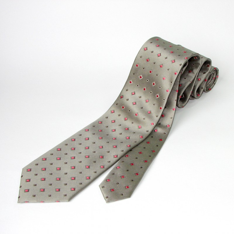 Lesklá kravata, zelenošedá barva, růžový foulard.